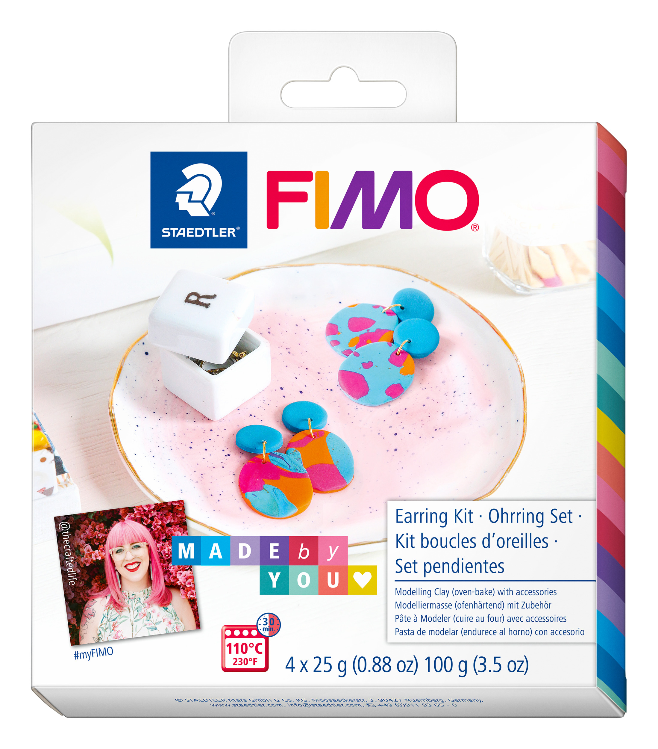 Zestaw masy plastycznej FIMO Made by you, z której można wykonać biżuterię, dekoracje i akcesoria. Opakowanie zawiera 4 masy po 25g w różnych kolorach, dwa dodatki do kolczyków, 10 kółek oraz 3 przecinaki.
