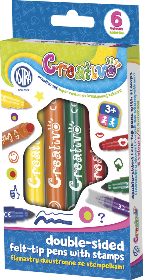 Flamastry dwustronne ze stempelkami, do kolorowania i robienia ozdobnych stempelków.