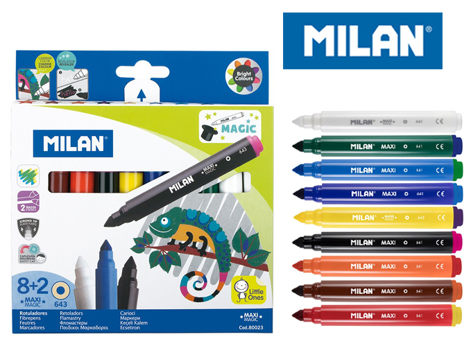 Flamastry MAXI MAGIC. W zestawie 8 kolorów i 2 magiczne mazaki, które w magiczny sposób zmieniają kolor flamastra na kolor skuwki, np. gdy narysujemy coś kolorem czarnym i przeciągniemy po tym białym (magicznym) flamastrem, to kolor w tym miejscu zmieni się na różowy. Flamastry z wytrzymałą i elastyczną stożkową końcówką o średnicy 8 mm, która nie wpada do środka nawet przy silnym nacisku. Po chwilowym odkształceniu końcówka zawsze wraca do pierwotnego kształtu. Pozwala na rysowanie cienkich i grubych linii (od 1 mm do 3,25 cm). Tusz na bazie wody. Żywe, intensywne kolory. Wentylowana skuwka. Flamastry MILAN są zgodne z europejskimi i amerykańskimi normami bezpieczeństwa. Nie zawierają ftalanów, metali ciężkich i innych substancji toksycznych. Są bezpieczne dla dzieci.