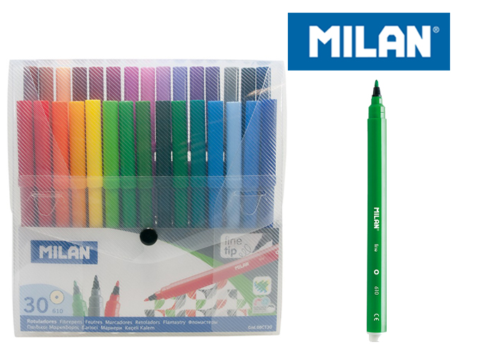 Zestaw 30 flamastrów w plastikowym etui w kształcie walizeczki. Flamastry z cienką końcówką o średnicy 2 mm. Tusz na bazie wody. Żywe, intensywne kolory. Flamastry MILAN są zgodne z europejskimi i amerykańskimi normami bezpieczeństwa. Nie zawierają ftalanów, metali ciężkich i innych substancji toksycznych. Są bezpieczne dla dzieci.