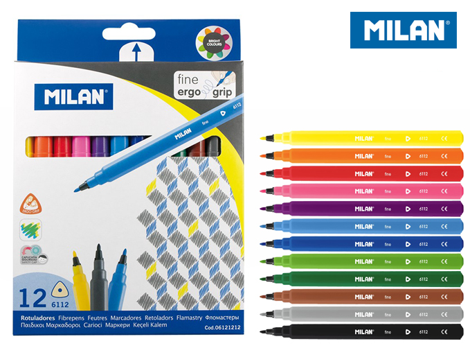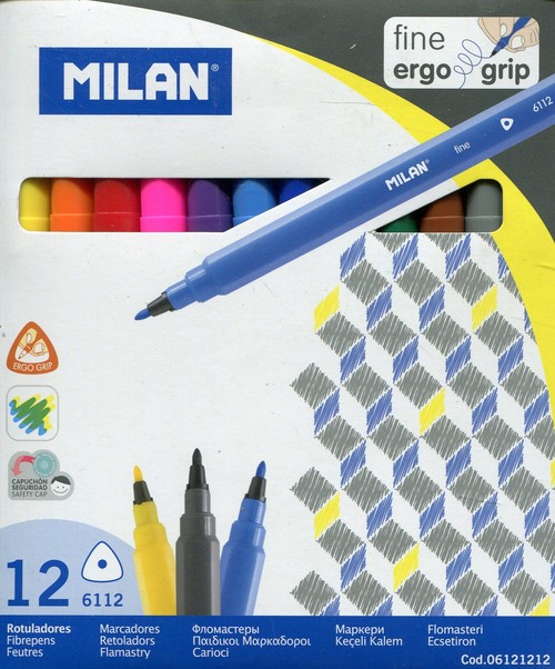 Flamastry z cienką końcówką o średnicy 2 mm. Ergonomiczny trójkątny kształt ułatwia trzymanie. Tusz na bazie wody. Żywe, intensywne kolory. Flamastry MILAN są zgodne z europejskimi i amerykańskimi normami bezpieczeństwa. Nie zawierają ftalanów, metali ciężkich i innych substancji toksycznych. Są bezpieczne dla dzieci.