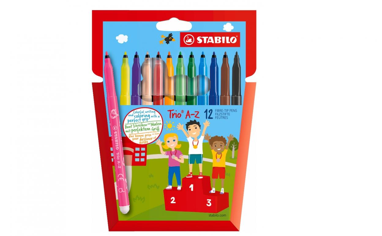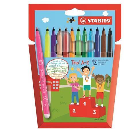 FLAMASTRY Z TRÓJKĄTNYM UCHWYTEM STABILO TRIO A-Z. KREATYWNOŚĆ OD A DO Z. Ergonomiczny, trójkątny uchwyt oraz mocna, odporna na złamanie końcówka. Flamastry posiadają wentylowaną skuwkę oraz łatwospieralny tusz.Kartonowe etui z zawieszką. 12 szt.