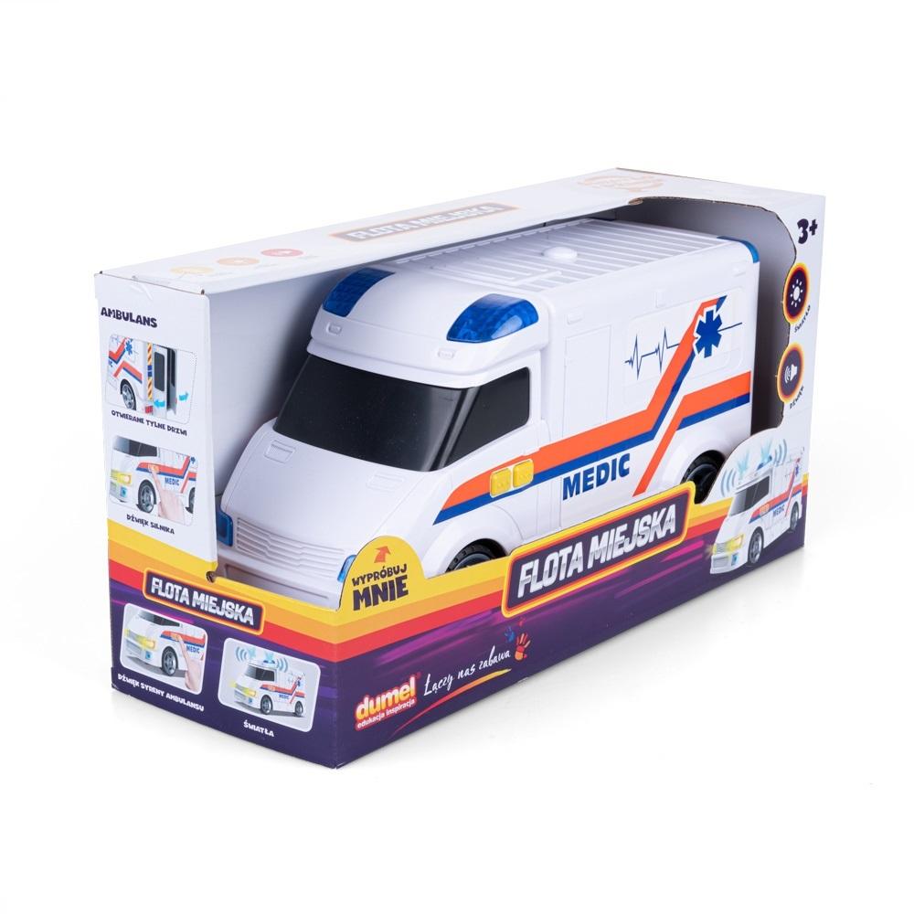 Karetka pogotowia ratunkowego, która wydaje realistyczne odgłosy. Autko wyposażone jest także w światła, a za uruchomienie poszczególnych funkcji odpowiadają przyciski umieszczone z boku zabawki. Tylne drzwi pojazdu otwierają się, dzięki czemu dziecko może umieścić w jego wnętrzu dowolną figurkę lub niewielką zabawkę.