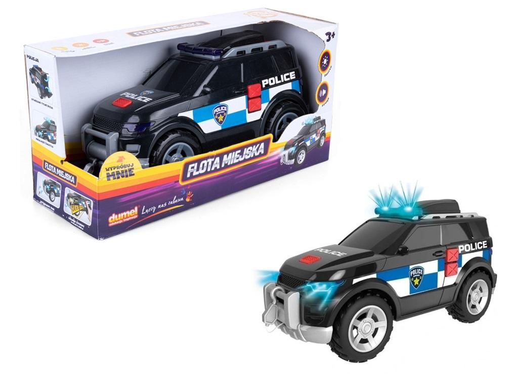 Samochód policyjny z serii Flota Miejska. Pojazd na baterie, świeci i wydaje dźwięki prawdziwej syreny policyjnej, ma również otwierane tylne drzwi i wysuwany hak holowniczy.