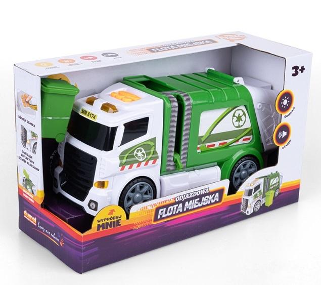 Śmieciarka wyposażona w 4 aktywne przyciski uruchamiające poszczególne funkcje: jazdę do przodu, do tyłu, zapalanie świateł oraz realistyczne dźwięki. Kiedy silnik pojazdu nie jest uruchomiony, koła swobodnie się poruszają, co umożliwia prowadzenie go ręką. W zestawie znajduje się zabawkowy kosz na śmieci.