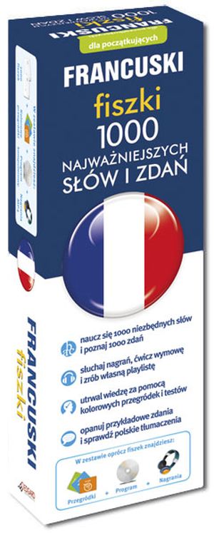 Francuski fiszki 1000 najważniejszych słów wraz z przykładowymi zdaniami to wyjątkowy zestaw, który tworzą: ponad 1000 ponumerowanych fiszek, płyta CD-ROM z nagraniami i programem oraz praktyczne pudełko z kolorowymi przegródkami. Nauka z kursem pozwala szybko i skutecznie opanować najczęściej używane w języku francuskim słówka. Opanowanie tego unikalnego zestawu umożliwia swobodną komunikację na poziomie podstawowym oraz czytanie ze zrozumieniem większości tekstów w języku francuskim. Przykłady użycia wszystkich słów w zdaniu to gotowe wzorce komunikacyjne. Fiszki podzielono na 40 praktycznych grup tematycznych, aby ułatwić zapamiętanie materiału metodą skojarzeń. Kolorowe przegródki pozwalają zaplanować naukę, a nagrania mp3 ułatwiają opanowanie prawidłowej wymowy.