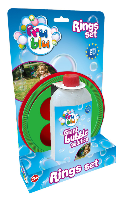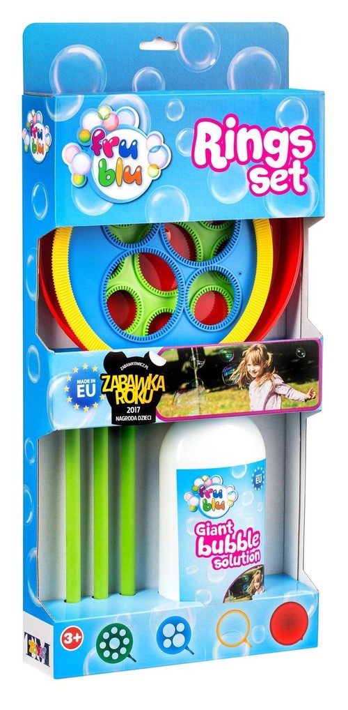 Zestaw zawiera płyn 0,5L, talerzyk, obręcz z 1 dużym otworem, obręcz z 4 otworami (2 różne wielkości), obręcz z 9 otworami, 3 rączki do obręczy - długość rączek ok. 17 cm.