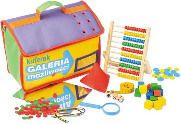 W kuferku pomocy dydaktycznych ,,Galerii możliwości"" dla klas 1-3 znajdą Państwo zabawki edukacyjne przeznaczone dla dzieci od lat 6 do 8. Są to: pchełki; drewniane klocki; sznurówki; lusterko; woreczek-piramidka; kostki do gry; miarka krawiecka; liczydło; lupa.Zabawki stanowiąpomoc w zdobywaniu umiejętności przewidzianych w podstawie programowej edukacji wczesnoszkolnej. Służą do rozwijania umiejętności przede wszystkim z zakresu edukacji matematycznej, ale także przyrodniczej, polonistycznej, plastycznejczy ruchowej.W kuferku znajduje się instrukcja, która zawiera propozycje zabaw. Broszurka podzielona jest na 9 części poświęconych opisowi i sposobowi wykorzystania każdej zabawki edukacyjnej. Zabawy są ułożone od najłatwiejszych do najtrudniejszych.Wierzymy, że znajdujące się w kufrze zabawki edukacyjne w połączeniu z inwencją i wyobraźnią dzieci sprawią, że opanowywanie różnych umiejętności stanie się atrakcyjną zabawą