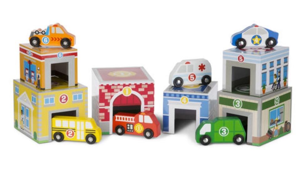 Kolorowy komplet garaży i dopasowanych do nich samochodzików. Możesz zbudować z garaży wieżę od największego do najmniejszego, złożyć jeden w drugi, albo porozkładać garaże w różnych miejscach na dywanie i jeździć między nimi przewożąc pacjentów, gasząc pożary lub zabierając inne samochody na lawetę. Dużo pomysłów na zabawę i równie dużo umiejętności do poznania. Nauka liczenia, nazywania kolorów, dopasowywania kształtów. Przepis na naukę przez zabawę.