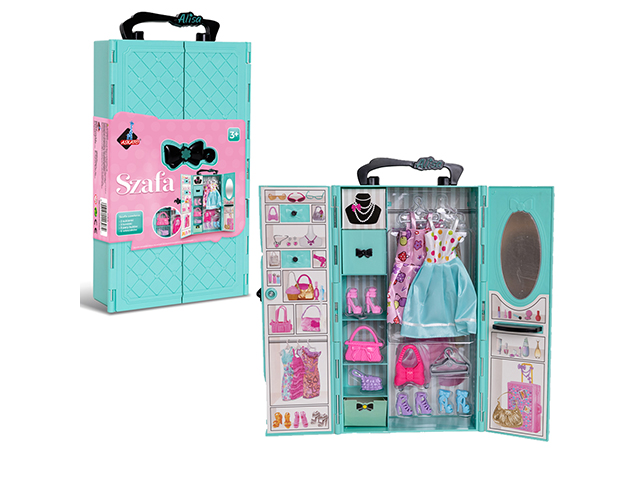 Garderoba to niezbędny mebelek dla lalek, który uporządkuje wszystkie akcesoria. Otwierana, pojemna szafa wyglądem przypomina prawdziwą- posiada drążek z wieszakami, półeczki oraz lusterko z półką na biżuterię.Garderoba wykonana jest w niebieskiej kolorystyce, posiada pikowanie na drzwiach oraz zamek zabezpieczający przed otwarciem.