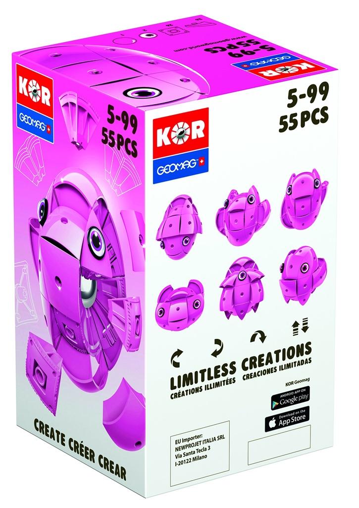 KOR Geomag - szwajcarskie klocki magnetyczne. Innowacyjny system konstrukcji pozwala na budowanie kosmicznych bohaterów oraz ich przeciwników. Postacie różnią się od siebie kolorem, maskami oraz rodzajami broni.