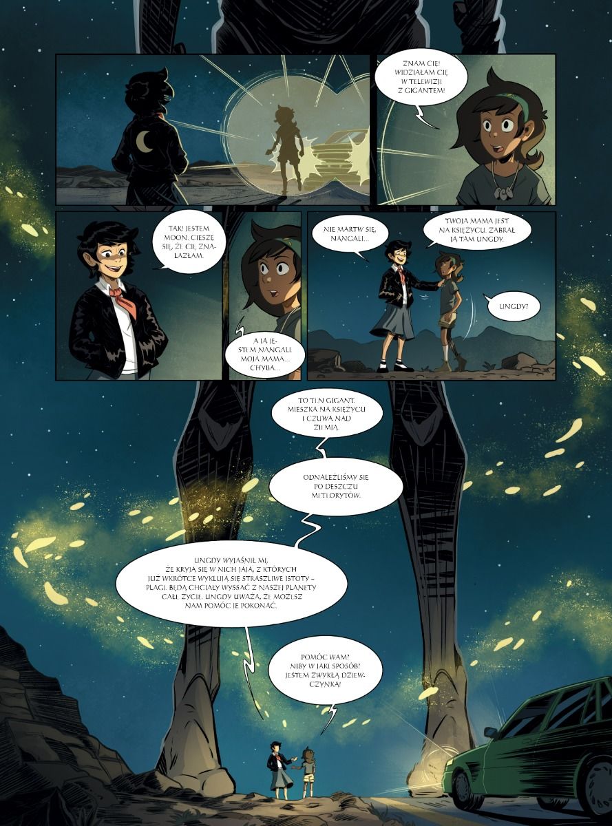 Ósmy tom serii o dzieciach połączonych tajemniczą więzią z niezwykłymi gigantami. Wcześniej deszcz meteorytów uderzył w Koreę Północną. W magmie tych ognistych kul drzemią niszczycielskie stwory, które zagrażają równowadze świata! Ta plaga dotknęła również Australię, gdzie mieszka tata jedenastoletniej Nangali. Mimo że dziewczynka nie widziała swojego ojca od lat, będzie mogła się schronić w tym dzikim regionie, gdzie gwiazdy świecą nocą z niesamowitą intensywnością. Tymczasem w Korei Moon, która odkryła swoje moce, wyruszyła na poszukiwanie innych olbrzymów zdolnych do walki z tą plagą. W towarzystwie olbrzyma, Ungdy’ego, wkrótce odnajdzie Nangali, aby zachęcić ją do przebudzenia swojego olbrzyma! Jeśli Nangali ujawni swoje moce, będzie wielkim sojusznikiem Moon. Razem mogą uratować ludzkość! Autorem scenariusza tej ekologiczno-apokaliptycznej serii jest Kanadyjczyk ukrywający się pod pseudonimem Lylian („Les Aventures débridées de Kenji le ninja”, „La Quête d’Ewilan”) oraz Francuzka Ingrid Chabbert (nominowana do Nagrody Eisnera za dwutomową serię „Elma, une vie d’ours”). Natomiast za rysunki odpowiada rysownik wszystkich wcześniejszych tomów serii „Giganci”, Francuz Paul Drouin („Titouan”, „LʼAventure fantastique”), a także Charline Forns, znana jako jedna z autorek serii „Strażniczka Małych Ludzi”.