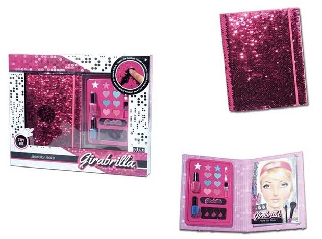 Pamiętnik z odwracanymi cekinami na okładce. W zestawie paletka kremowych cieni do powiek, 2 butelki lakieru do paznokci, separator do pedicure oraz akcesoria.