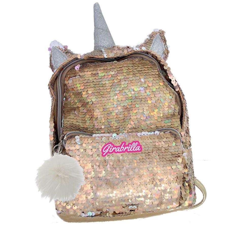 Cekinowy plecak z motywem jednorożca. Wykonany z materiału z odwracanymi cekinami. Zapinany na suwak, z przodu posiada jedną kieszeń.
