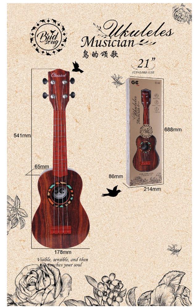 Plastikowa gitara ukulele. Wymiary: 54,1 x 17,8 x 6,5 cm. Wymiary opakowania: 68,8 x 21,4 x 8,6 cm.