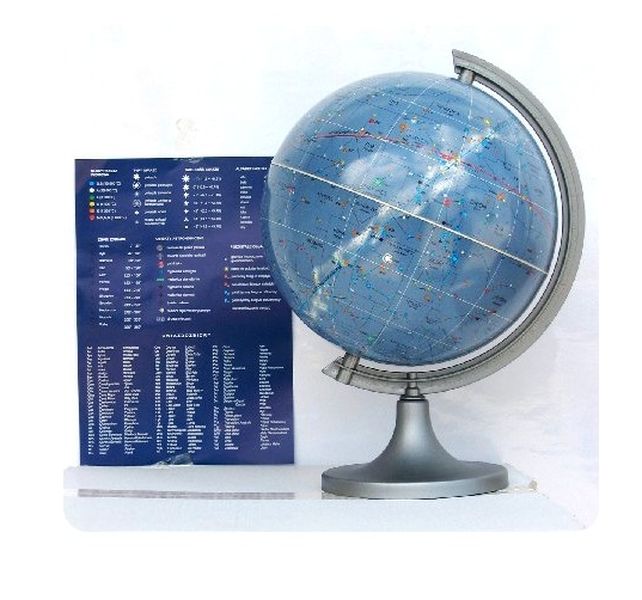 Na globusie uwidoczniono gwiazdozbiory. Zaznaczono klasyfikację widmową gwiazd, ich typy, wielkość, znaki zodiaku i inne niż gwiazdy obiekty astronomiczne (skupiska gwiazd, galaktyki, mgławice itp.).