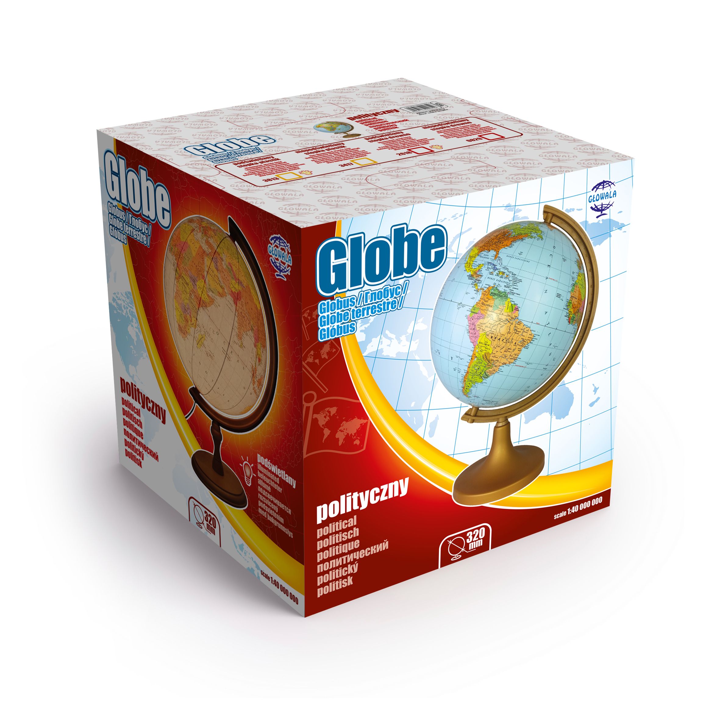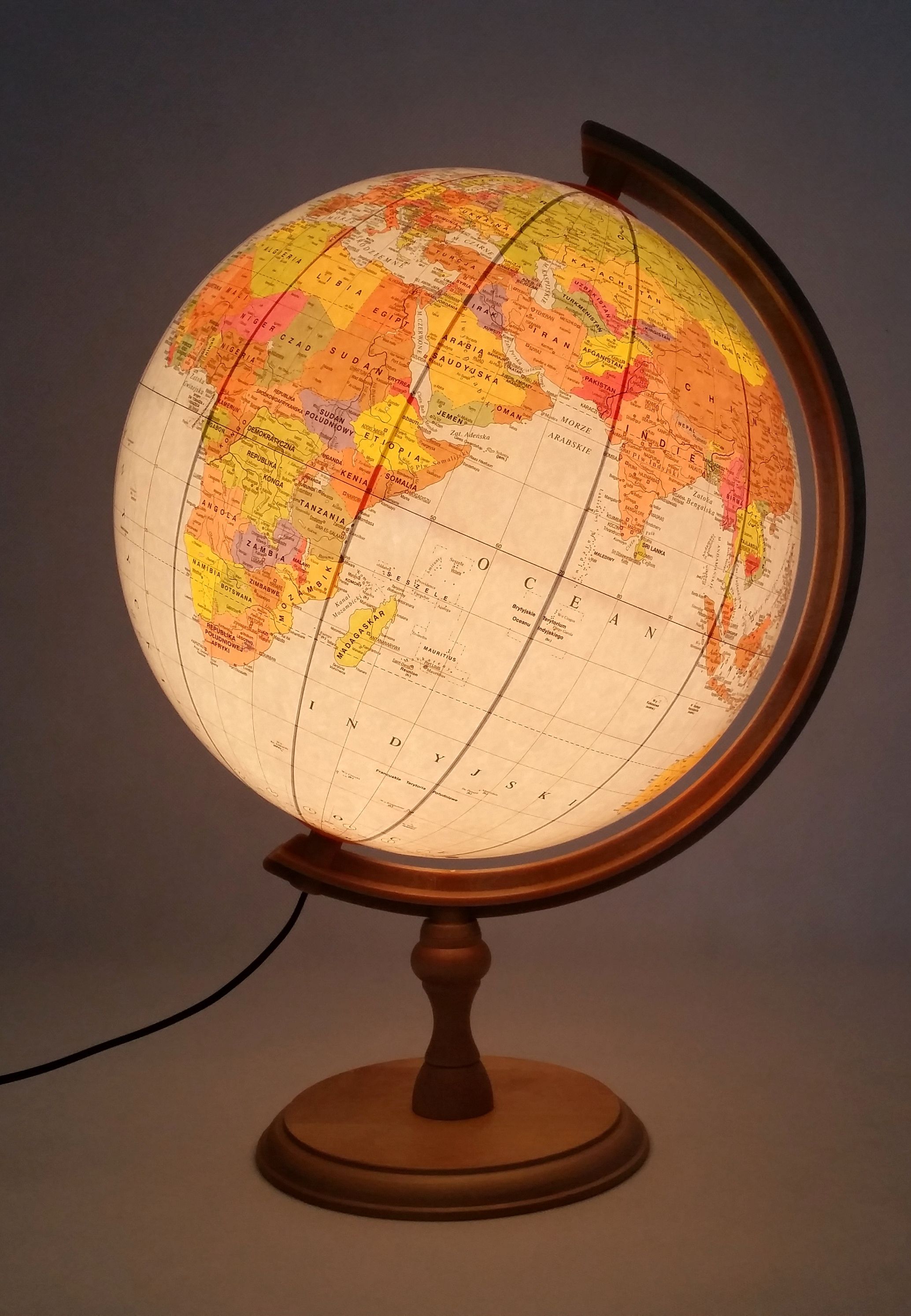Globus 320 mm podświetlany, mapa polityczna, stopka drewno cięciwa plastikowa.