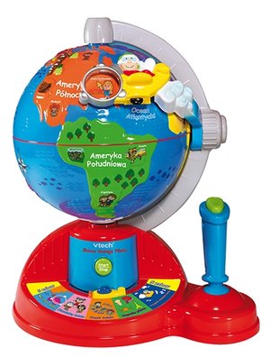 Zapraszamy dzieci do podróży przez kolorowy świat VTech! Globus Małego Pilota to interaktywna zabawka stworzona po to, aby dzieci już od najmłodszych lat mogły poznawać świat z bliska. 5 wariantów zabawy w formie opowiadań i quizów oraz ruchomy joystick pozwalają dziecku samodzielnie sterować zabawą i podejmować decyzje o kierunku podróży, rozbudzając jego ciekawość i wyobraźnię. Z małym pilotem poleci także lektor, który zaproponuje wykonanie określonych zadań i podzieli się wiedzą o krajach i ich mieszkańcach.Podczas zabawy dziecko steruje samolotem i zatrzymuje lupę w miejscu, o którym chce usłyszeć ciekawostkę lub które wskazuje jako odpowiedź w zadaniu. Dzięki temu ćwiczy koordynację ruchową i spostrzegawczość, poznając jednocześnie podstawy geografii. Poprawne odpowiedzi zostaną nagrodzone. W odwiedzanych krajach maluch zostanie przywitany w obcym języku! Wyląduje też w znanych miejscach świata, by przy dźwięku silnika wyruszyć w dalszą podróż. Globus kręci się w trakcie lotu, co gwarantuje fantastyczną zabawę na okrągło!Polska wersja językowa5 wariantów zabawyRuchoma kulaCiekawostki geograficzne i niezbędne oznaczenia na mapieCzujnik lotu, ruchomy joystick - sterFunkcja automatycznego wyłączania oszczędza baterieRozbudza ciekawość świata i wyobraźnię, ćwiczy koordynację wzrokowo-ruchową.