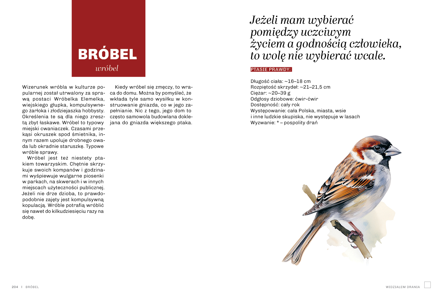 Dowiecie się, gdzie i kiedy można spotkać poszczególnych pierzastych potomków dinozaurów. Jak robi wróbel, a jak dzięcioł i kawka. Każde z nich oczywiście robi brzydko sobie nawzajem i otoczeniu, ale dodatkowo wydają różne podejrzane odgłosy, które warto znać, żeby wiedzieć, który drań was tym razem obudził.