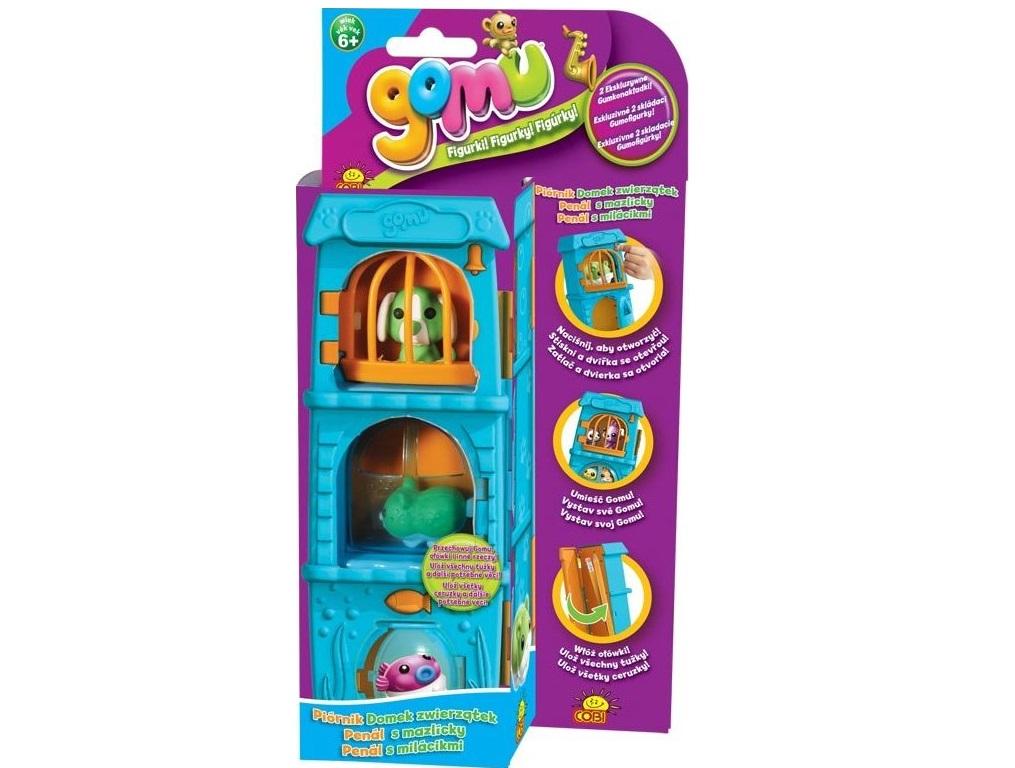 Domek Zwierzątek - niebieski piórnik doskonały zarówno dla chłopców jak i dla dziewczynek. Z przodu piórnika są okienka - otwierane automatycznie za pomocą 2 przycisków dzwoneczka i rybki, drzwiczki od klatki czy okienko imitujące akwarium, do którego można włożyć Gomu - rybkę! Umieszczając zwierzątka Gomu w okienkach, piórnik będzie wyglądał zachwycająco. Z tyłu do piórnika można schować np. ołówki i inne przybory do pisania.