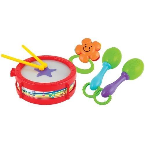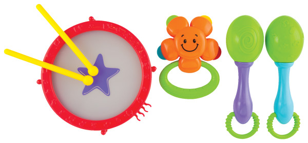 Zestaw zawiera 3 instrumenty: bębenek z pałeczkami, marakasy i tamburyn.