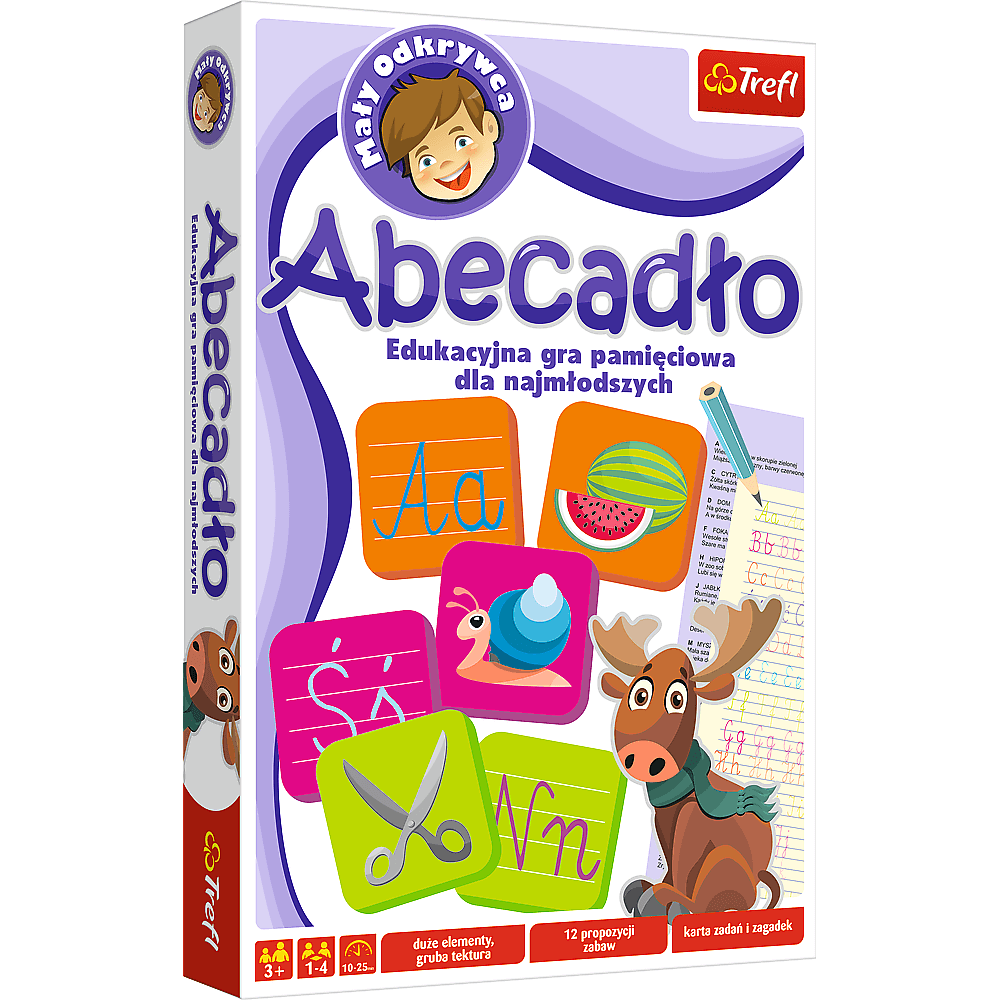 Abecadło to wesoła zabawa w dopasowywanie literek do obrazków. Rozwija słownictwo u najmłodszych dzieci, uczy budowania poprawnych odpowiedzi oraz rozpoznawania przedmiotów i kojarzenia ich z nazwą. W grze wykorzystano specjalnie wyselekcjonowane słownictwo, które ma związek z najbliższym otoczeniem dziecka, a także litery pisane (wielka i mała litera), dające dobry wzorzec w przyszłej edukacji wczesnoszkolnej. Produkt dostarcza wiele pomysłów na zabawę - dziecko ma możliwość zabawy w pojedynkę, jak również w grupie rówieśników. Do gry dołączone są scenariusze i propozycje do wykorzystania przez rodziców.Opakowanie zawiera 29 par kartoników: pierwszy kartonik - litery (mała i wielka) napisane na linijkach, drugi kartonik - desygnat rozpoczynający się na daną literę; a także instrukcję z wieloma propozycjami zabaw.Duże elementy z grubej tektury są pokryte wysokiej jakości farbami, co gwarantuje bezpieczną zabawę nawet dla małych dzieci. Wyraźne rysunki i żywe kolory są dopasowane do stopnia rozwoju dziecka.Seria Mały Odkrywca to gry edukacyjne dla dzieci w wieku od 2 do 5 lat. Wszystkie pozycje zostały opracowane przez zespół specjalistów z różnych dziedzin: pedagogiki, filologii, logopedii, socjologii oraz psychologii. Każda z gier została przygotowana, by wspomagać rozwój poznawczy i intelektualny dziecka: rozwija myślenie logiczno-matematyczne, stymuluje rozwój słownictwa i zdolności komunikacyjne, ćwiczy koordynację wzrokowo-ruchową, trenuje pamięć i koncentrację, pobudza wyobraźnię oraz kreatywność. Nasze produkty to połączenie zabawy z elementami edukacyjnymi, a jednocześnie twórcze pomysły na spędzenie czasu z dzieckiem.Produkty z serii Mały Odkrywca są testowane przez dzieci oraz pozytywnie opiniowane przez nauczycieli przedszkolnych. Nasze produkty zostały opracowane i wyprodukowane w Polsce.