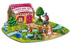 Domek Baby Jagi ma otwierane drzwi i okna. Nie jest więc tylko opakowaniem, ale także elementem układanki. Duża, kolorowa plansza składa się z 36 puzzli z dużą ilością otworów, w których można dowolnie umieszczać postacie i rekwizyty.Wiek: od 4 lat.