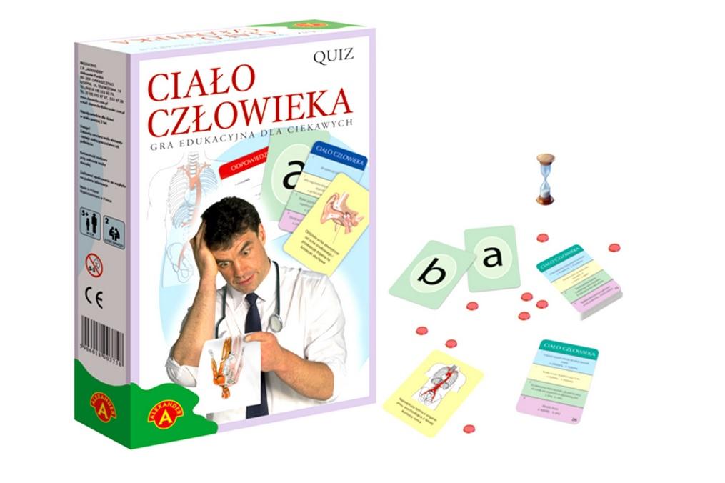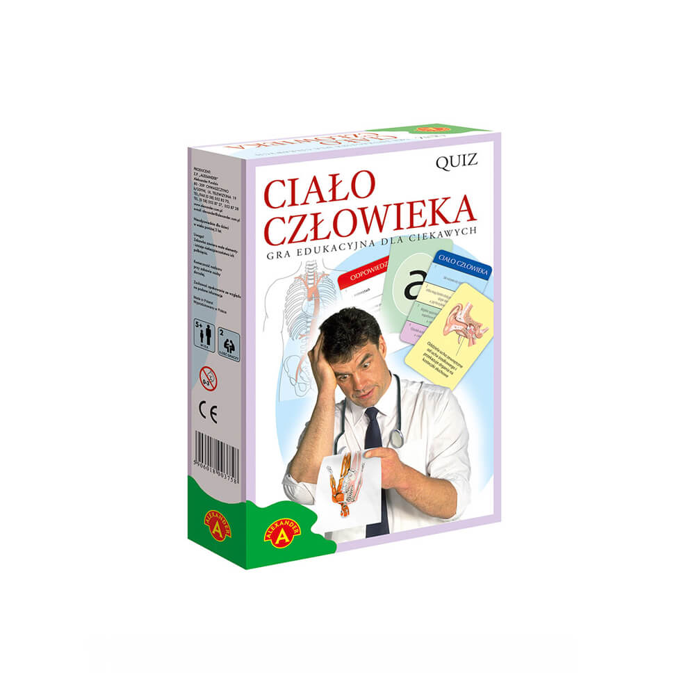 Quiz-CIAŁO CZŁOWIEKA"" to gra edukacyjna dla 2-3 osób. Jej uczestnicy rywalizują ze sobą odpowiadając kolejno na pytania wskazywane na kartach pytań i odpowiedzi. Tematem pytań jest budowa i funkcjonowanie ciała człowieka. W czasie emeocjonującej zabawy gracze mogą dowiedzieć się wielu interesujących faktów o budowie i działaniu własnego ciała.