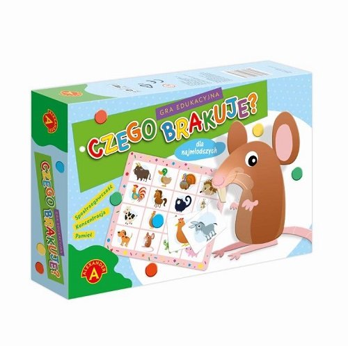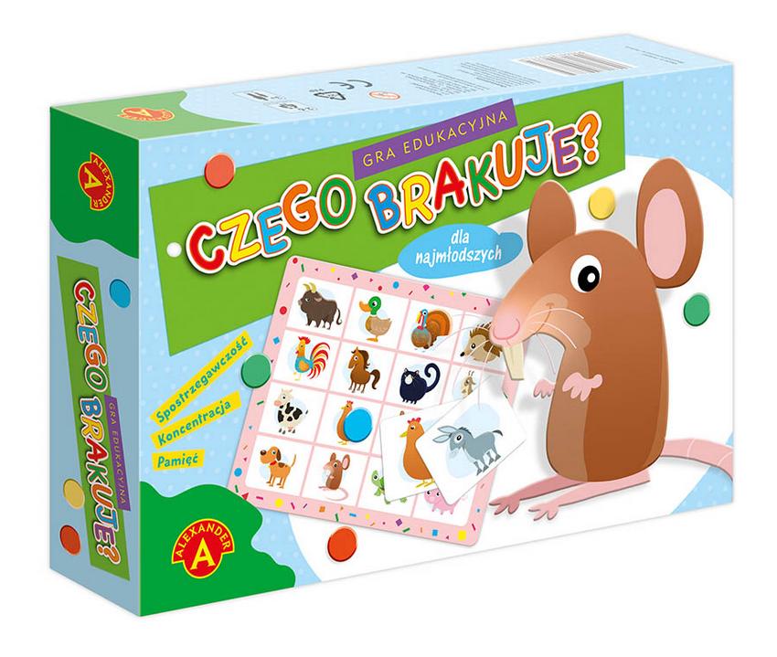 Czego brakuje"" to gra edukacyjna, która zapewnia dużo dobrej zabawy dla graczy w różnym wieku (dla dzieci i dorosłych). Jednocześnie, to bardzo dobry trening koncentracji, spostrzegawczości, a przede wszystkim pamięci. Zasady gry są proste, każdy z graczy otrzymuje swoją planszę z wizerunkami 16 zwierząt. Na stole rozkłada się 6 tabliczek z obrazkami, które znajdują się także na planszy każdego gracza. Po krótkiej chwili tabliczki przewraca się rewersem do góry i miesza, odkładając jedną z nich na bok. Pozostałe odwraca się ponownie obrazkiem do góry - czy wiesz, której tabliczki brakuje do kompletu?Zawartość pudełka: 6 plansz ze zdjęciami, 16 tabliczek z obrazkami, 12 żetonów, 60 czarnych żetonów, instrukcja.