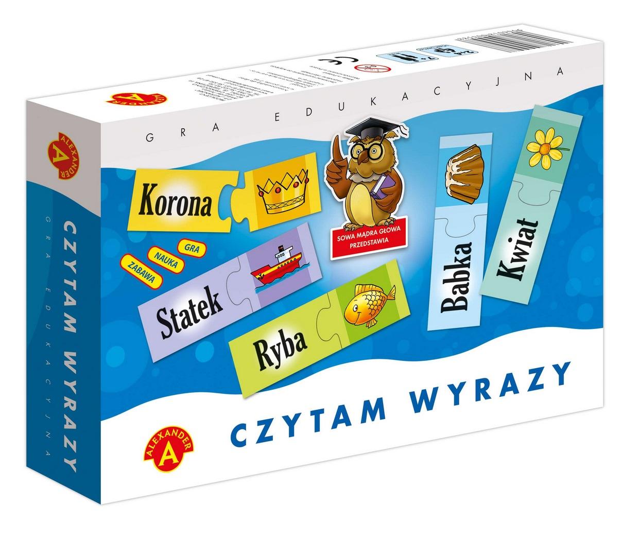 ,,Czytam wyrazy"" - gra i zabawkaedukacyjna dla dzieci uczących sięczytać. Z puzzli leżących na stole należy odnaleźć jaknajwięcej pasujących do siebie par, z których jedenelement przedstawia obrazek, a drugi pierwszą literęnazwy obrazka lub jego nazwę. Po połączeniuwłaściwych elementów gracz czyta literę i wymawianazwę obrazka. Wygrywa ten, kto ułoży najwięcejpuzzli i prawidłowo wymówi znajdujące się na nichlitery lub nazwy.