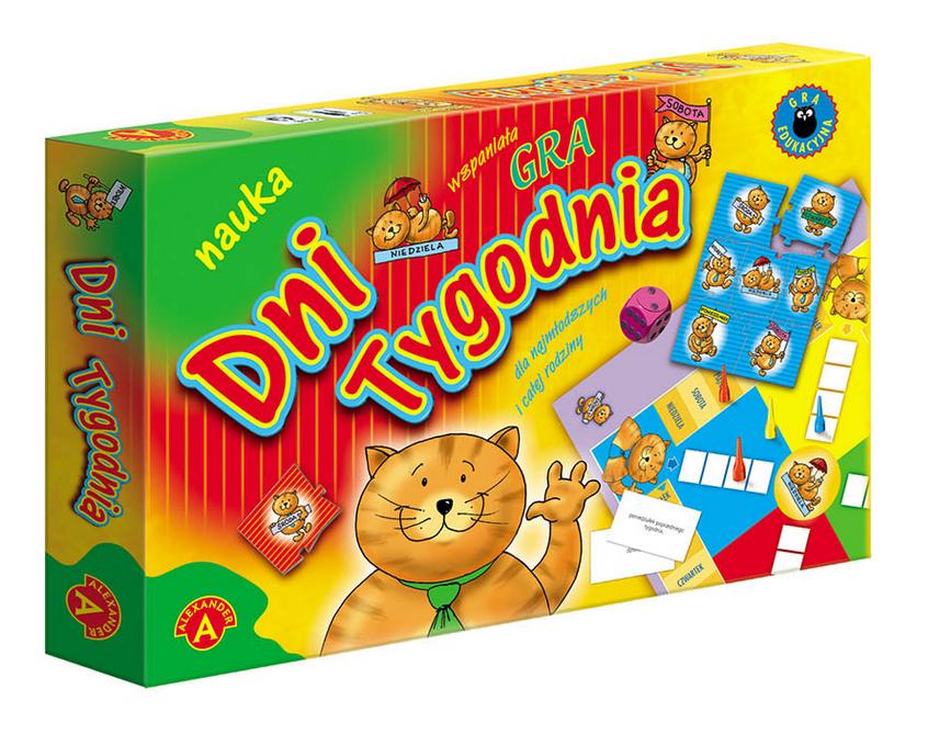 Dni tygodnia"" to znakomita gra dla najmłodszych i całej rodziny. W trakcie gry wykorzystuje się wiele atrakcyjnych rekwizytów. Gracze poruszają się pionkami po polach oznaczających dni tygodnia. Kto dotrze pierwszy do pola po środku planszy, ten wygrywa. Po drodze trzeba mieć jednak wiele szczęścia na różnych etapach gry. Ważny jest udany rzut kostką, ale również istotne jest losowanie karty z poleceniem decydującym o dalszym ruchu. Przepustką do etapu ostatecznej rozgrywki jest ułożenie puzzli. Dzieci w trakcie gry poddając się emocjonującej atmosferze uczą się nie tylko nazw dni tygodnia, ale również ogólnej orientacji w czasie, przyswajając sobie zwroty podawane na kartach, np. ""poniedziałek poprzedniego tygodnia"", ""za dwa dni"", ""środek następnego tygodnia"", itp.