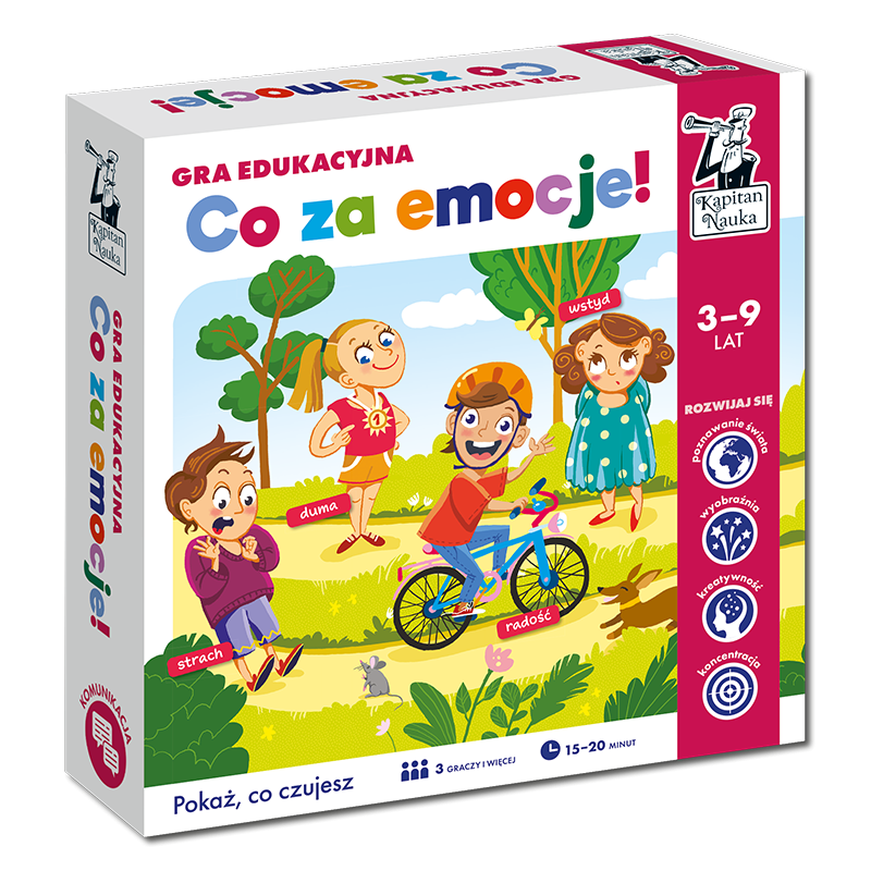 Gra edukacyjna Co za emocje! (39 lat) to kreatywna i żywiołowa gra dla młodszych dzieci, które uczą się rozpoznawać swoje i cudze uczucia oraz je wyrażać. Zadaniem gracza jest zaprezentować pozostałym uczestnikom przedstawioną na karcie emocję w określony sposób. Można to robić za pomocą min, krótkiej opowieści, dźwięków i odgłosów lub rozpoznając emocję na podstawie wyrazu twarzy. To świetny trening komunikacji, który pobudza wyobraźnię emocjonalną, kreatywność, empatię oraz umiejętność kojarzenia, a nade wszystko dostarcza dużo emocji i śmiechu!