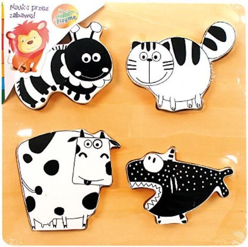 Drewniane puzzle w kolorze czarno-białym, zaokrąglone kształty.
