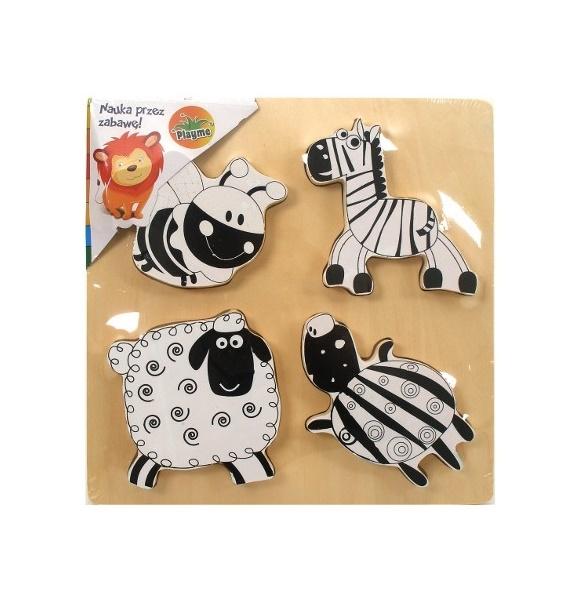 Drewniane puzzle w kolorze czarno-białym, zaokrąglone kształty.