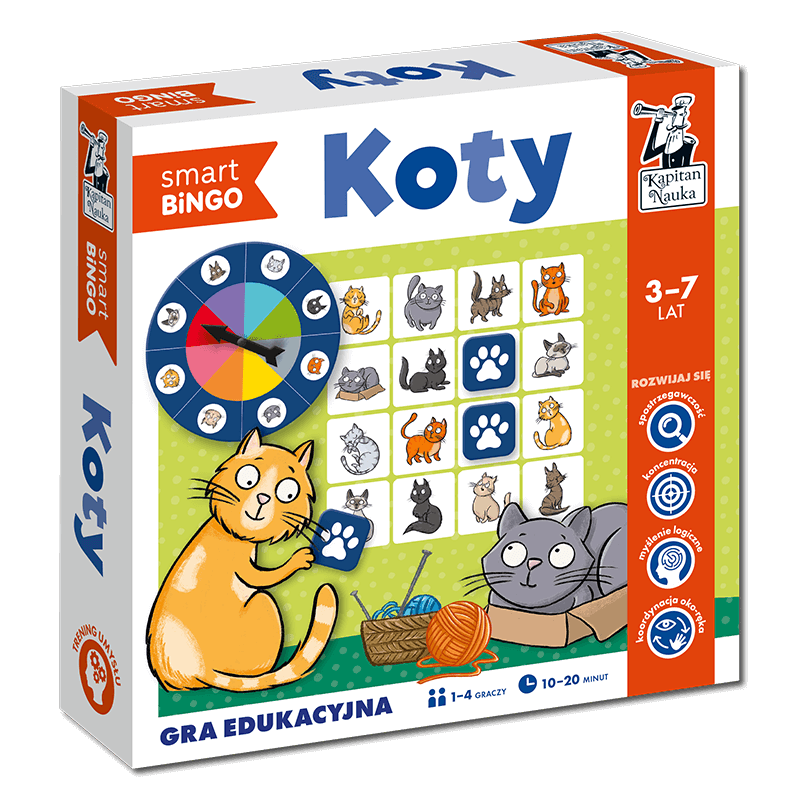 Gra edukacyjna Koty. Smart bingo (37 lat) została przygotowana z myślą o przedszkolakach. Umożliwia ona wiele wariantów rozgrywek. Najprostszy polega na wyszukiwaniu kocich kłębków i zabawek w tym wylosowanym kolorze na swojej planszy i zaznaczeniu czterech sąsiadujących ze sobą pól na planszy (w pionie, poziomie lub po skosie). W nieco trudniejszej wersji gracze szukają kotów tej samej rasy (i koloru), które mogą jednak przybierać różne pozy na planszy, inne niż na kole losującym. Dla zaawansowanych zawodników przygotowano wariant z elementami planowania strategii. Aby zdobyć pasek zwycięstwa, można zaznaczyć tylko jedno pole z dwóch pasujących, gracz musi więc zdecydować, który ruch przybliży go do zwycięstwa.