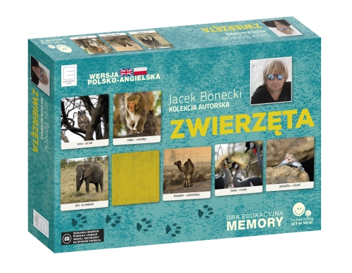 Kolekcja autorska znanego i cenionego fotografa Jacka Boneckiego. Doskonała zabawa dla całej rodziny (od 3 do 100 lat).Zagraj razem z dzieckiem w memory i znajdź 24 pary zdjęć zwierząt wykonanych przez Jacka Boneckiego. Memory ze zwierzętami przygotowane zostały w polsko-angielskiej wersji językowej.