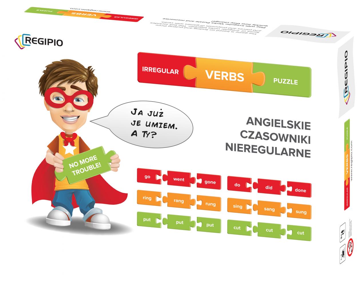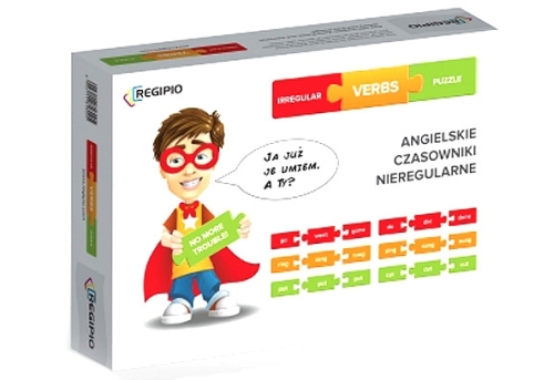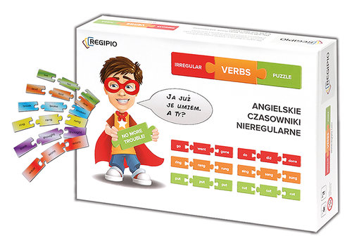 Gra polegająca na znalezieniu i ułożeniu w słowną układankę trzech form czasowników nieregularnych.Podzielone kolorystycznie grupy czasowników pozwalają na zauważenie pewnych prawidłowości np. teach taught taught , catch caught caught. Dzięki temu uczestnicy gry bez większego wysiłku zapamiętują czasowniki nieregularne po kilkakrotnym ułożeniu puzzli.Idealna forma nauki dla wszystkich o modalności wzrokowej i kinestetycznej. Gra zamieniająca żmudną naukę czasowników nieregularnych w zabawę.Przeznaczona dla dzieci i dorosłych.Pomocna zarówno na lekcjach jak i w domu.Gra składa się z 90 czasowników nieregularnych i przeznaczona jest do gry w grupach 2-3 osobowych.