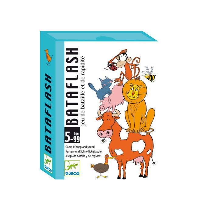 Bataflash to gra karciana na spostrzegawczość. Kto pierwszy zauważy, które zwierzątko jest na kartach wszystkich graczy i powie jego nazwę, wygrywa kolejkę! Zwycięzcą jest ten, kto zbierze najwięcej kart. Wspaniała gra dla całej rodziny. Wiek: 5 -99 lat liczba graczy: 2 - 4 Zawartość: 32 karty Producent Djeco Zasady gry: karty potasować i rozdać pomiędzy wszystkich graczy (przy 3 graczach należy usunąć 2 karty, które pozostaną po rozdaniu). Każdy gracz układa w talii przed sobą swoje karty - obrazkiem na dół. W tym samym momencie każdy z uczestników odwraca pierwszą kartę ze swojej talii. Pierwszy z graczy, który rozpozna zwierzę znajdujące się na wszystkich odwróconych kartach wykrzykuje jego nazwę: -zwierzę pojawia się we wszystkich kartach - gracz zbiera wszystkie odkryte karty i wkłada na spód swojej talii. -gracz pomylił się: każdemu z uczestników gracz daje po jedenej karcie, które chowają się na spodzie swoich talii. Następnie gra jest kontynuowana. Jeżeli nie ma zwierzęcia, które pojawiłoby się na wszystkich kartach, należy wtedy włożyć te karty na spód talii i odkryć kolejne. Wygrywa gracz, który zdobędzie wszystkie karty.