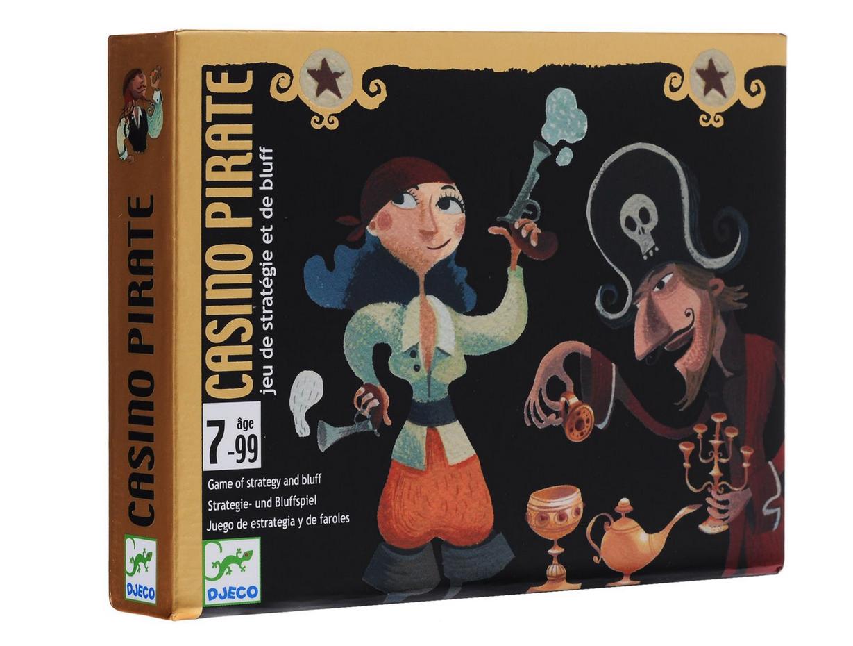 Gra Casino Pirate Żeby zwiększyć swoje szanse prawdziwi piraci muszą wiedzieć jak blefować bez mrugnięcia okiem! Grać w kasynie i tak jak pirat! Wiek: 7-99 Liczba graczy: od 3 do 5 Wymiary opakowania:17x11x2,5 cm Zawartość: 7x4 kart ""szlachetne kamienie"" 12 kart ""kawałki złota"" 1 karta ""kościotrup"" 4 karty ""skały"" 50 skarbów używanych do licytacji. Cel gry: dostać się jak najbliżej do skarbu wartego 7 i 1/2 lub sprawić, aby pozostali gracze myśleli, że tak jest. Zasady gry: gracze decydują czy gra ma trwać przez określony przez nich czas czy należy ją przerwać jak któremuś z graczy zabraknie skarbów. Rozdaj każdemu po 10 skarbów. Pozostałe skarby nie biorą udziału w grze. Gramy zgodnie z ruchem wskazówek zegara. Zaczyna najstarszy. Tasuje wszystkie karty, układa z nich stosik i trzyma w ręce ukrywając obrazki. Wartość kart: - Kamień szlachetny 1-7 pkt - Kawałek złota 1/2 pkt. - Skała0 pkt. Szkielet: gracz może nadać jej wartość między 1i 7 punktów, ile potrzeba. Jest to karta ""joker"". Następnie rozdaje każdemu graczowi po 1 karcie. Gracze patrzą na swoje karty bez ujawniania ich i w zależności od gry, mogą postawić 1 lub 2 skarby, które następnie kładą przed sobą na środku stołu. Następnie gracz, który siedzi po lewej stronie od rozdającego może: - trzymając kartę obrazkiem do dołu zawołać ""gotowy!"", co oznacza, że nie chce innej karty, - zawołać ""karta"", aby uzyskać inną od rozdającego i postarać się znaleźć jak najbliżej skarbu wartego 7 1 / 2 i nie więcej. Może on poprosić o tyle kart, ile chce. Może mieć tylko jedną ukrytą kartę przed sobą, ale ta karta może się zmieniać w zależności od postępu w jego grze. Wszystko, co trzeba zrobić, to odwrócić ukrytą kartę aby następnie ukryć kolejną, itp. Dlatego, zawsze jest jedna karta, która jest nieznana dla przeciwników. Kiedy nie chce już więcej kart,woła ""gotowy!"" Kolejka przechodzi na następnego gracza, itp. Kiedy wszyscy gracze są ""gotowi"", lider próbuje osiągnąć 7 1 / 2. Odwraca 1 kartę na przed nim, potem następną, itp. Dla lidera wszystkie karty są widoczne. On może przestać kiedy chce: - albo przekracza 7 1 / 2 i ""płaci"" (z jego skarbów) innym graczom ekwiwalent jego początkowego zakładu (np. dla zakładu z 2 obiektów, gracz wygrywa 4: 2 własnych + 2 podane przez lidera). - albo nie przekracza 7 1 / 2 ale myśli, że jest bliżej niż jeden z graczy: prosi więc gracza aby pokazał swoje karty. Jeśli jest bliżej, gracz daje mu swój zakład. Jednakże, jeśli gracz ma lepszy układ, odzyskuje swój zakładu i oprócz tego lider daje mu taką samą kwotę. Zanim poprosi kolejnego gracza o pokazanie kart może, jeśli chce, podjąć ryzyko dobierając 1 lub więcej kart, aby spróbować zbliżyć się lub uzyskać 7 1 / 2. W ten sposób ryzykuje, że uzyska ponad 7 1 / 2 i będzie musiał oddać swoje skarby pozostałym. Zanim zwróci się do pozostałych graczy, do niego należy ocena ryzyka w zależności od tego, jakie sam ma karty i przypuszczenia jakie karty mają pozostali gracze. Jeśli gracz wie, że przegrywa z liderem, może przekazać mu swój zakład bez pokazywania kart - unika wtedy odkrywania swojej strategii. Jeśli wartość jest równa, wygrywa prowadzący. Pierwszy gracz, który odkryje karty na prośbę prowadzącego pokaże,że ma dokładnie 7 i 1/2: - uzyskuje podwójną stawkę od prowadzącego, chyba, że prowadzący też uzyskał 7 i 1/2, - zostaje prowadzącym w następnej kolejce. W przeciwnym razie prowadzący pozostaje ten sam, chyba, że któryś z graczy zgłosi się na ochotnika.