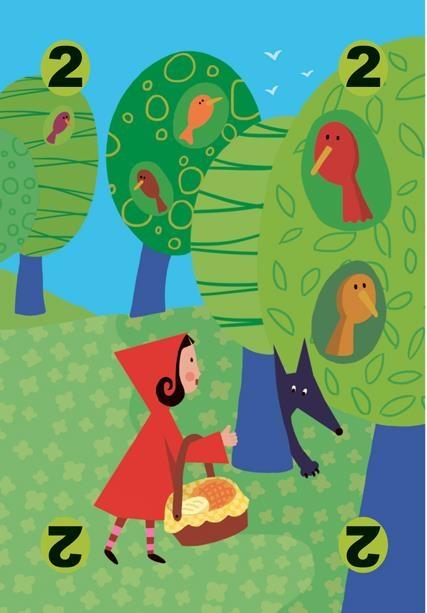 Gra karciana .zawartość: 50 kart (24 karty ,,opowieści"" + 10 kart z wilkiem +8 kart z myśliwym w lesie + 8 kart z wilkiem w lesie).Cel gry- Być pierwszym,który,korzystając z kart,,opowieści"" ułoży w całość historie o czerwonym kapturku.Walory edukacyjne:gra ucząca taktyki,ćwicząca wyobrażnię. Cel gry- Być pierwszym , który korzystając z kart ,,opowieści"" ułoży w całość historie o czerwonym kapturku . Przygotowania-na środku stołu ułożyć w okręgu 8 dowolnych kart, przedstawiających wilka w lesie bądź leśniczego w lesie, obrazkiem do dołu. Pozostałe 8 kart z obrazkiem ,,lasu"" położyć na stosiku pośrodku utworzonego okręgu z kart. Potasować razem 34 kary (24 kary ,,opowieści i 10 kart z wilkiem) i rozdać po 3 dla każdego z graczy, reszta kart utworzy talię do grania. Reguły gry- Zaczyna najmłodszy z graczy. Podczas każdej kolejki gracze mają 3 opcje ruchu:- położyć przed sobą kartę ,,opowieści"" z jakimkolwiek numerem , oprócz karty z numerem 6 która musi być grana na końcu.-zwrócić jedna z 3 swoich kart z powrotem do talii kart ( odkładamy ja zawsze pod spód talii)- spróbować wygrać kartę opowieści , wyłożona przez przeciwnika poprzez położenie na niej karty z wilkiem. Jeśli dojdzie do takiej sytuacji , wówczas gracz , na którego kartę został położony ,,wilk"" , stara się uchronić swoja kartę , odwracając jedna z kart z obrazkiem lasu tworzących okrąg . Zanim się to stanie gracz ,,broniący"" swojej karty , musi unieść ręce nad okrąg kart i powiedzieć wierszyk : ,, Kiedy wilka gdzieś poniesie, bawimy się w lesie. Kiedy wróci na swe włości , pożre nas w całości."" następnie gracz odwraca jedna z kart ,,lasu"" tworzących okrąg i jeśli: - odwrócona karta przedstawia wilka w lesie , gracz ,,broniący"" swojej karty opowieści , traci ją na rzecz przeciwnika , który położył wcześniej kartę wilka na wybrana kartę ,,broniącego"" . Wygrywający może dzięki zdobytej karcie zacząć układać swój rząd kart opowieści , bądź dołożyć ją do już posiadanych kart , uzupełniając swoja opowieść .Karta wilka wraca na spód talii. -odwrócona karta przedstawia leśniczego w lesie, gracz ,,broniący"" krzyczy ,,bang"" i wilk zostaje zabity , a karta obroniona. Karta wilka wraca na spód talii. Zawsze po skończonym ruchu , gracze muszą dobrać kartę z talii kart , tak aby ,,na reku"" mieli zawsze 3 karty .Gra toczy się zgodnie z ruchem wskazówek zegara. Zawsze kiedy z koła kart ,,lasu"" jedna z kart zostaje odkryta , musi być zastąpiona kolejna karta ze stosika znajdującego się pośrodku okręgu utworzonego przez karty ,,lasu"". Odwrócona karta wraca na spód stosiku. Koniec gry- wygrywa ten z graczy , który jako pierwszy ułoży całe opowiadanie składające się z 6 kart ,,opowieści"". Wiek dziecka :4-7 lat. Wielkość opakowania :11,7 x 8,5 x 2,8 cm