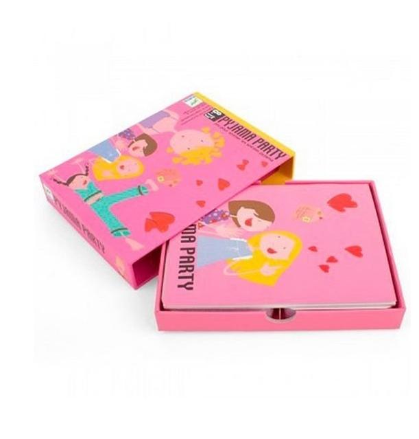 Gra karciana . Zawartość : 92 karty : 20 kart "" chińskie obrazki "" , 20 kart "" fant "" , 20 kart "" prawdziwe historie "" ,20 kart "" historie zmyślone "" , 12 ""jokerów"" . Co to jest przyjęcie piżamowe ?Zaproś przyjaciółki do siebie na noc. Spędźcie wieczór na opowiadaniu sobie różnych historii , układaniu fryzur, malowaniu czy wyznawaniu sekretów. Ale przede wszystkim śmiejcie się i bawcie jak najlepiej !. Cel gry: Zakończyć grę bez ostatniej karty w ręku. Ilość gracz:2-6 Wiek graczy : 9-13 lat. Wielkość opakowania : 15,6 x 11,7 x 3,2 cm instrukcja : http://www.visionone-kids.pl/DJECO-INSTR/DJ05191_PL.pdf