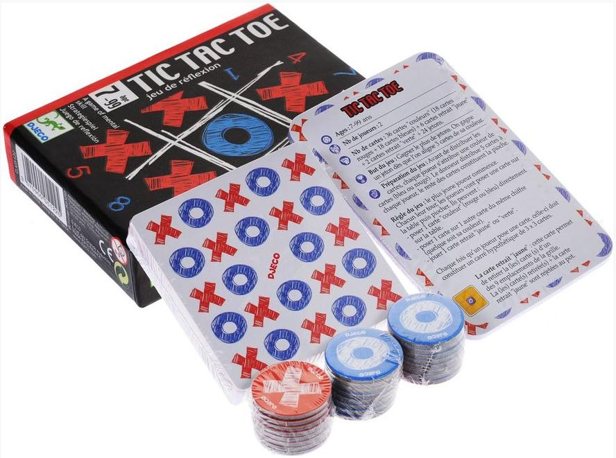 Gra karciana , zawiera : 36 kart z kolorami ( po 18 kart czerwonych i niebieskich ) , 6 żółtych kart cofnięcia , 2 zielone cofnięcia , 24 żetony Cel gry: wygrywa ten, kto zbierze największą liczbę żetonów, żeton wygrywa się wtedy, kiedy ułoży się 3 karty swojego koloru w linii. Przygotowanie do gry: 1. Przed rozdaniem kart gracze ustalają jakiego koloru karty wybierają (niebieskie bądź czerwone), 2. Gracze otrzymują po 5 kart, a pozostałe karty tworzą stos (w każdej grze zmienia się rozdający), Zasady gry: 1. zaczyna najmłodszy z z graczy, w każdej kolejce gracze kładą jedną kartę na stole i losują, mają następujące możliwości: 1. położyć kartę kolorów (czerwoną bądź niebieską) bezpośrednio na stole, 2. położyć jedną kartę na drugiej o tym samym numerze (obojętne jakiego koloru), 3. zakryć kartą cofnięcia zieloną lub żółtą 4. za każdym razem kiedy gracz wykłada kartę, ostatnia musi być położona tak, aby utworzyć kwadrat 3*3 karty, 5. żółta karta cofnięcia pozwala na wycofanie karty bądź kart z jednej z 9 pozycji tworzących kwadrat 3*3. Wycofana karta bądź karty + karta cofnięcia żółta są odkładane na bok, 6. zielona karta cofnięcia pozwala na wycofanie wszystkich kart tworzących ""kompletne"" linie poziome lub pionowe lub po skosie. Wycofane karty + zielona karta cofnięcia są odkładane na bok. Wiek : 6-99 lat + Liczba graczy : 2 wielkość opakowania : 11,7 x 8,5 x 2,8 cm