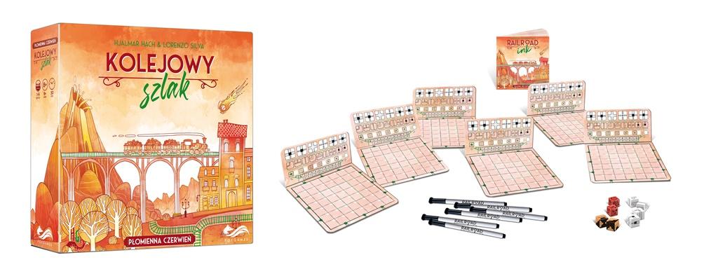 W Kolejowym szlaku gracze rzucają kośćmi, a następnie rysują trasy na swoich planszach. Pod koniec gry zdobywają punkty za swoje najdłuższe trasy oraz za stworzenie sieci połączeń. Muszą jednak uważać, bo za niezamknięte trasy mogą stracić punkty. W Płomiennej Czerwieni możemy skorzystać z kostek meteorytów i lawy, aby zwiększyć możliwość punktowania. Meteoryty niszczą trasy, ale są źródłem surowców, a lawy rozlewają się, przynosząc punkty za największy obszar. Łącząc Płomienną czerwień z Głębokim błękitem możesz zagrać nawet w 12 osób! Zawartość: 6 pisaków 4 kostki trasy 2 kostki lawy 2 kostki meteorytu 6 plansz instrukcja Liczba graczy 1-6 Wiek 8+