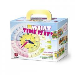 Pięknie ilustrowana gra dla dzieci w różnym wieku. Można grać na wiele sposobów. Opakowanie zawiera 24 obrazki przedstawiające sceny z życia dziecka, do których należy dopasować puzzel z odpowiednią godziną na zegarze analogowym. Zegar z ruchomymi wskazówkami pozwala na ustawić dowolną godzinę.