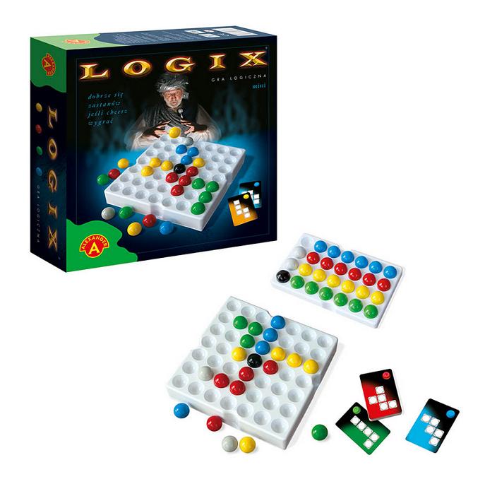Logix"" przestrzenna gra planszowa, w której liczy się taktyka, wyobraźnia, i szczęśliwy traf. W trakcie gry gracz losuje swój tajny kod, którego wzór musi potem ułożyć z kolorowych kul na planszy. Ruch gracza może nastąpić poprzez dołożenie kuli, zdjęcie lub zamianę kul co dodatkowo dodaje grze elementów rywalizacji. Zestaw zawiera przestrzenną planszę, podstawkę do kul, 6 czerwonych kul, 6 zielonych kul, 6 żółtych kul, 6 niebieskich kul, 2 szare kule, 1 czarną kulę, 16 kart kodów oraz instrukcję.Gra dla 2-4 osób w wieku od 10 lat.
