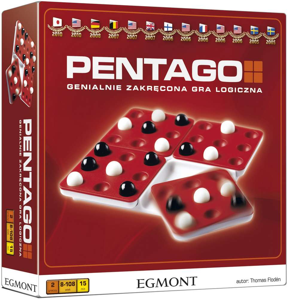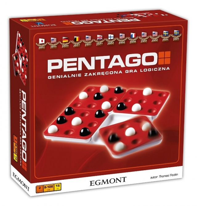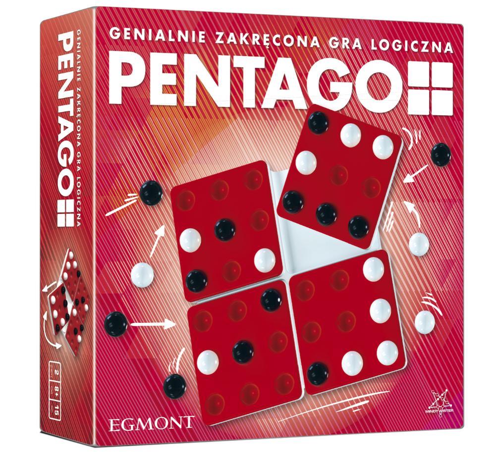 Widzieliście kiedyś grę z ruchomą planszą? Musicie poznać grę ""PENTAGO"", zdobywczyni trzynastu nagród w Europie, Stanach Zjednoczonych i Japonii!Wydawnictwo Egmont wprowadza na rynek 2-osobową grę ""PENTAGO"", która zdobyła szereg nagród na całym świecie. Gra przeznaczona jest dla dorosłych wielbicieli gier logicznych, jednak jej proste zasady pozwolą cieszyć się nią również dzieciom w wieku powyżej 8 lat.Polskie wydanie będzie specjalną edycją gry, umożliwiającą zabranie gry w podróż, do szkoły lub na spotkanie z przyjaciółmi bez konieczności dźwigania całego pudełka.Na czym polega ""PENTAGO""? Gracze na przemian układają na planszy po jednej kuli w swoim kolorze. Wygra gracz, który jako pierwszy ułoży 5 swoich kul w jednej linii. Wydaje się łatwe? Tylko pozornie - po wyłożeniu każdej kuli gracz obraca jedną z czterech ruchomych części planszy o 90 stopni! Żeby wygrać trzeba włączyć logiczne myślenie!Gra dla 2 graczy w wieku od 8 lat.Czas trwania rozgrywki: 15 min.