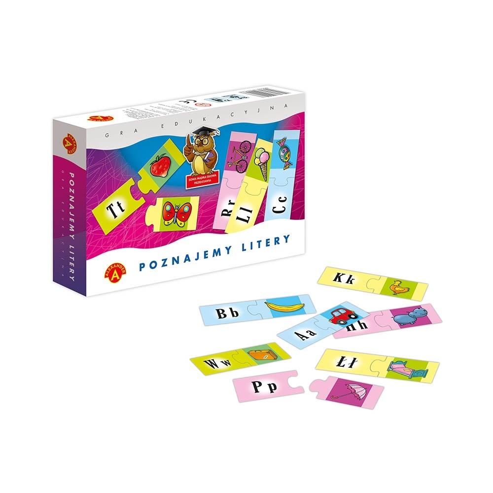 ,,Poznajemy litery"" - gra i zabawkaedukacyjna dla dzieci poznających litery. Z puzzli leżących na stole należy odnaleźć jaknajwięcej pasujących do siebie par, z których jedenelement przedstawia obrazek, a drugi pierwszą literęnazwy obrazka lub jego nazwę. Po połączeniuwłaściwych elementów gracz czyta literę i wymawianazwę obrazka. Wygrywa ten, kto ułoży najwięcejpuzzli i prawidłowo wymówi znajdujące się na nichlitery lub nazwy.