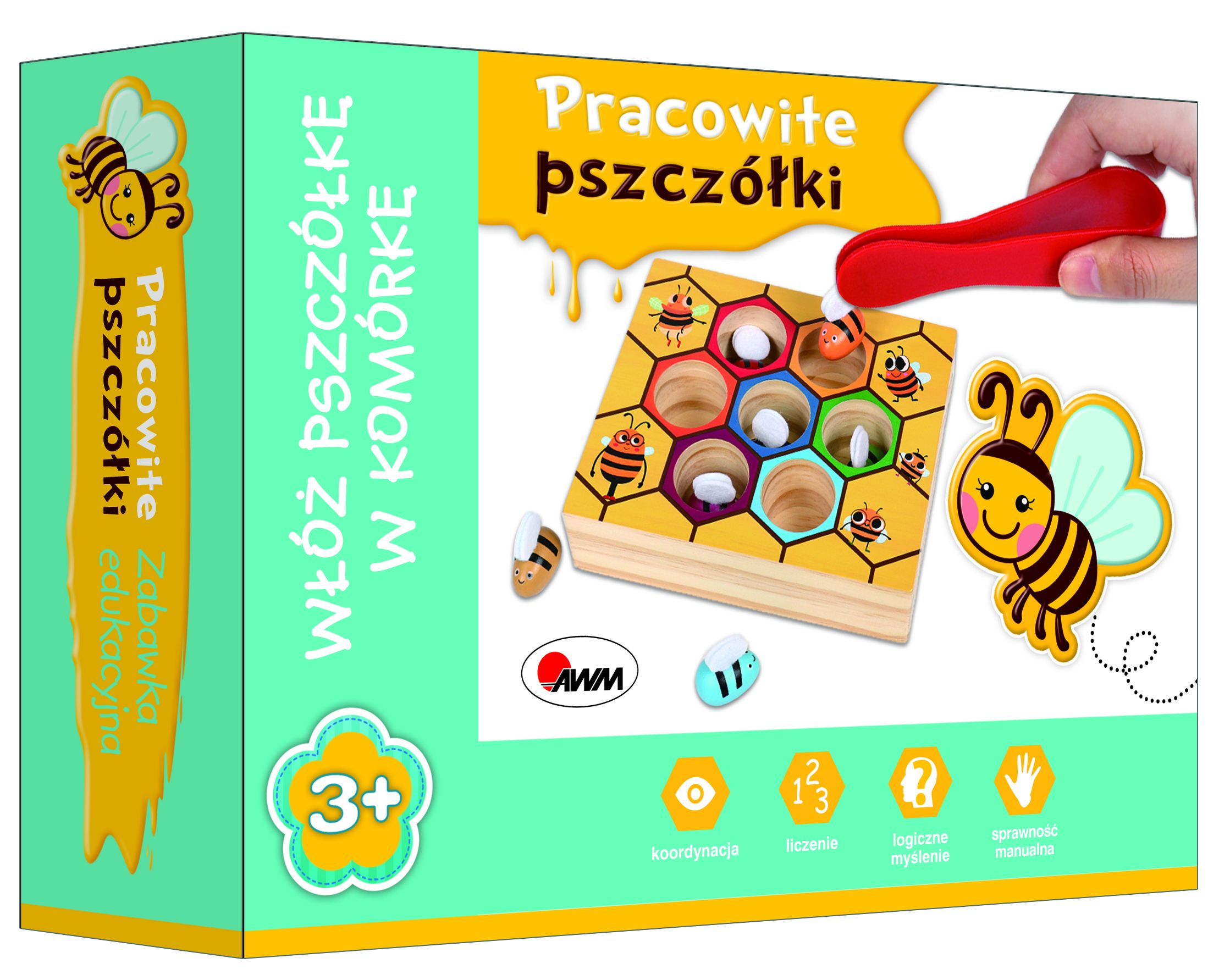 „Pracowite pszczółki” to solidnie wykonana drewniana zabawka edukacyjna. Zadaniem malucha jest umieszczenie pszczółki w odpowiednim kolorze w oznaczonej tym samym kolorem komórce. Do tego celu służy plastikowa pęseta. Zabawkę można wykorzystać jako grę zręcznościową.