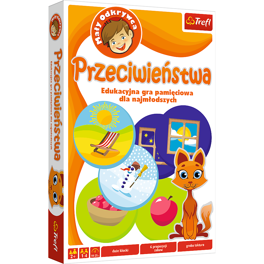 Przeciwieństwa są grą, w której dziecko ma za zadanie dopasować pary przeciwieństw. Gra pomaga w porządkowaniu wiedzy o otaczającym dziecko świecie. Produkt dostarcza wiele pomysłów na zabawę – dziecko ma możliwość zabawy w pojedynkę, jak również w grupie rówieśników. Do gry dołączone są scenariusze i propozycje do wykorzystania przez rodziców.