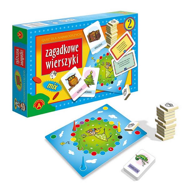 Zagadkowe wierszyki - mix"" to gra w której dzieci odpowiadają na zagadki, umieszczone na 55 kartach i sprawdzają swoją zręczność podczas układania "" wieży"" z plastikowych tabliczek. Zwycięzcą zostanie gracz, który zdobędzie najwięcej żetonów za prawidłowe odpowiedzi i budowanie wieży.